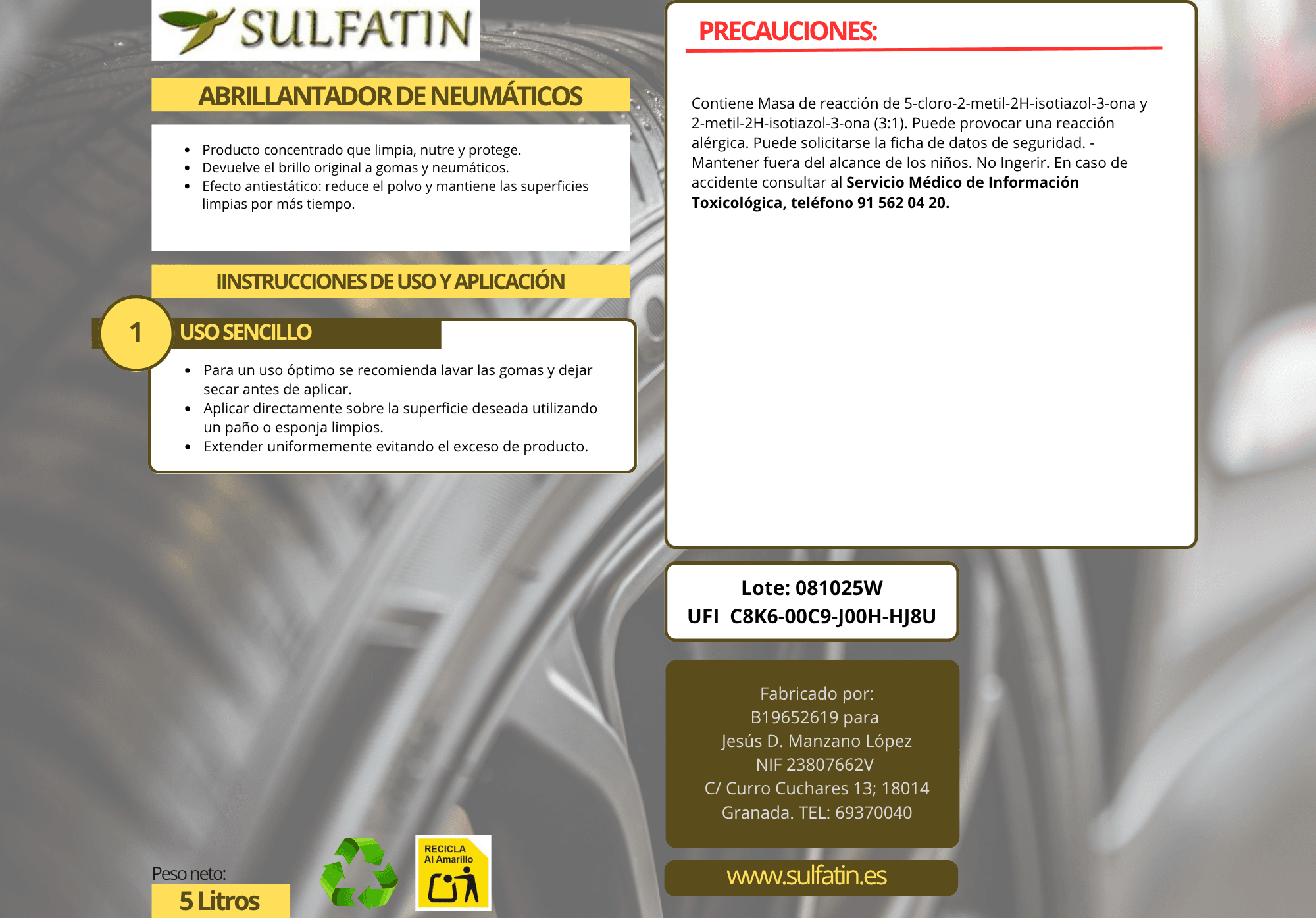 Abrillantador profesional diseñado para la limpieza y mantenimiento de neumáticos. Su fórmula concentrada limpia, nutre y protege las gomas, devolviendo el brillo original sin dejar residuos grasos.