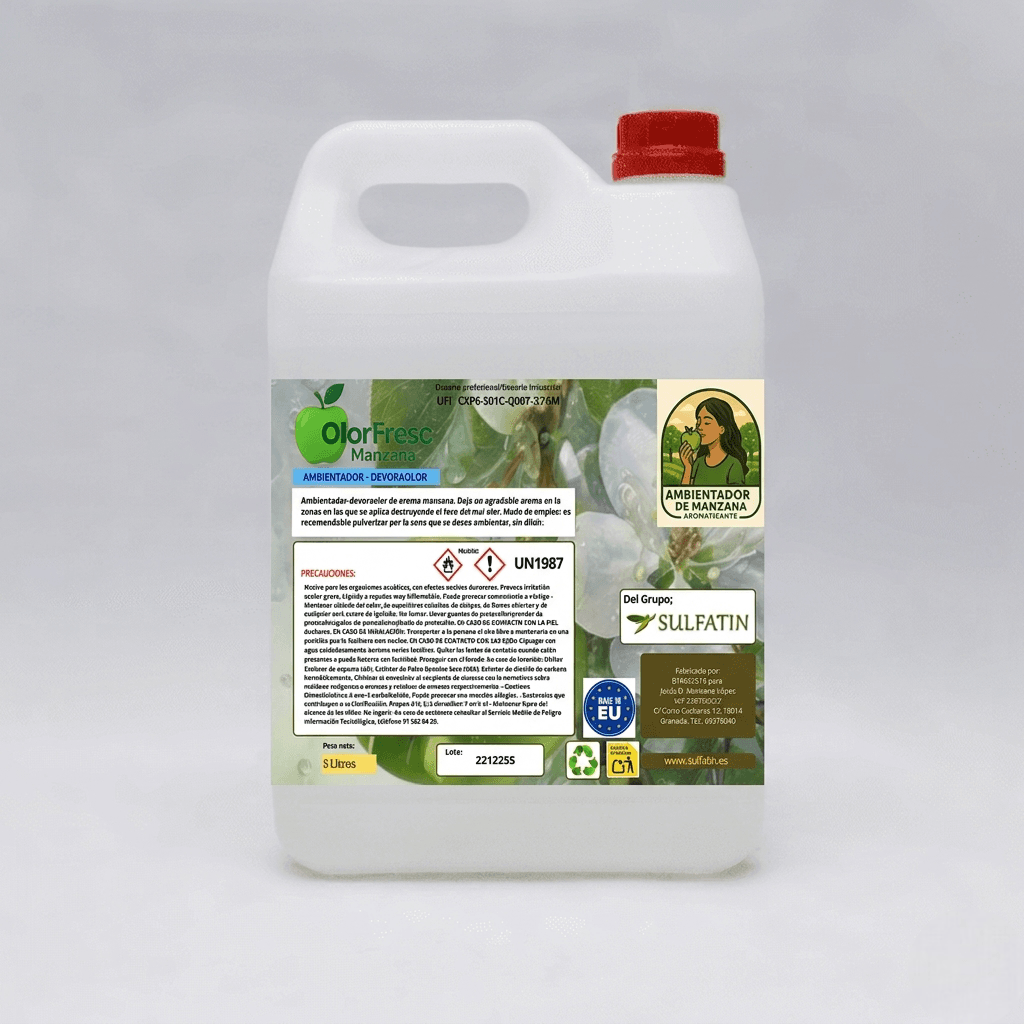 El Ambientador-Devoraolor OlorFresc Manzana de Sulfatin es una solución industrial diseñada para usuarios profesionales que buscan una eliminación radical del mal olor. A diferencia de los aerosoles convencionales, este potente desodorizante no se limita a enmascarar las fragancias desagradables; su formulación activa con tensioactivos ataca directamente las moléculas y microorganismos que generan el foco del hedor, destruyéndolos al contacto.