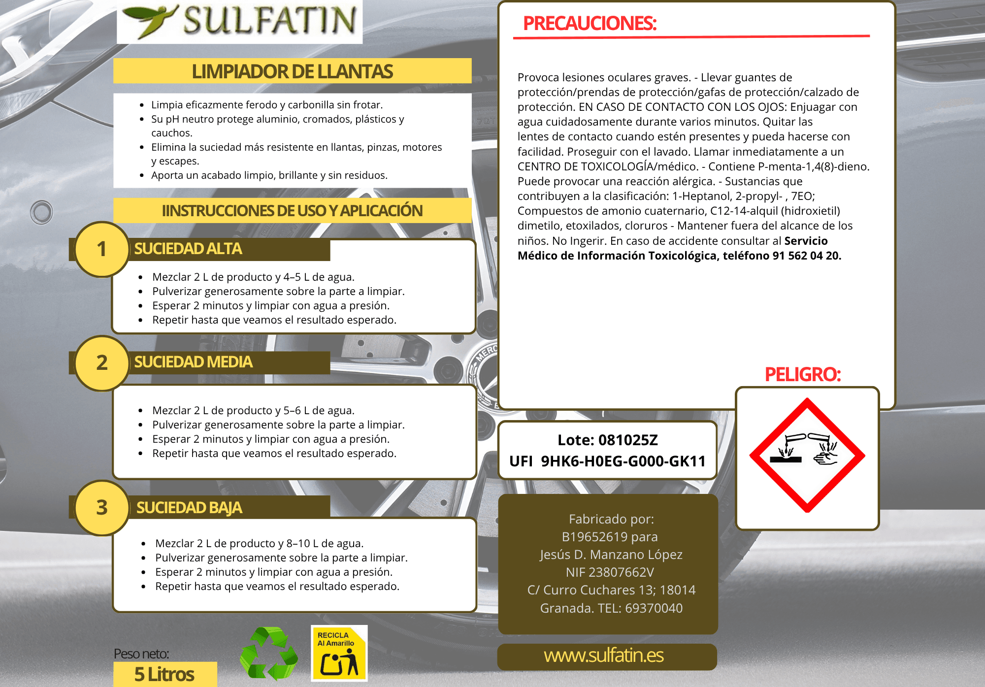 Limpiador profesional de llantas formulado para eliminar eficazmente la suciedad más resistente, como ferodo, grasa, polvo de freno y carbonilla. Su pH neutro lo hace seguro para aluminio, cromados, plásticos y cauchos, garantizando un resultado impecable sin dañar las superficies.